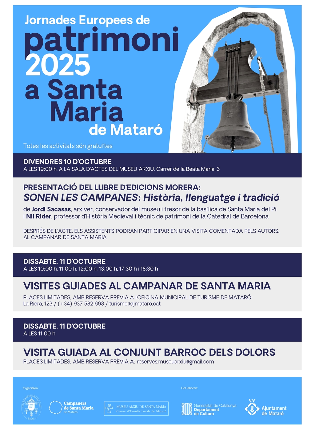 El divendres 10 a les 19 h, a la sala d’actes del Museu Arxiu, es farà la presentació del llibre d’Edicions Morera Sonen les campanes. Història, llenguatge i tradició de Jordi Sacasas, arxiver, conservador del museu i tresor de la basílica de Santa Maria del Pi i Nil Rider, professor d’Història Medieval i tècnic de patrimoni de la Catedral de Barcelona. En acabar, els assistents podran participar en una visita comentada pels autors al campanar de Santa Maria. El dissabte 11 a les 11 h hi haurà una visita guiada a la capella dels Dolors, i durant tot el dia sis torns de visites guiades al campanar de Santa Maria. Totes les visites són gratuïtes amb inscripció prèvia a reserves.museuarxiu@gmail (Capella dels Dolors) i a l’Oficina Municipal de Turisme situada a la Riera 123: turisme@mataro.cat, telèfon (+34) 937 582 698 (Campanar).
