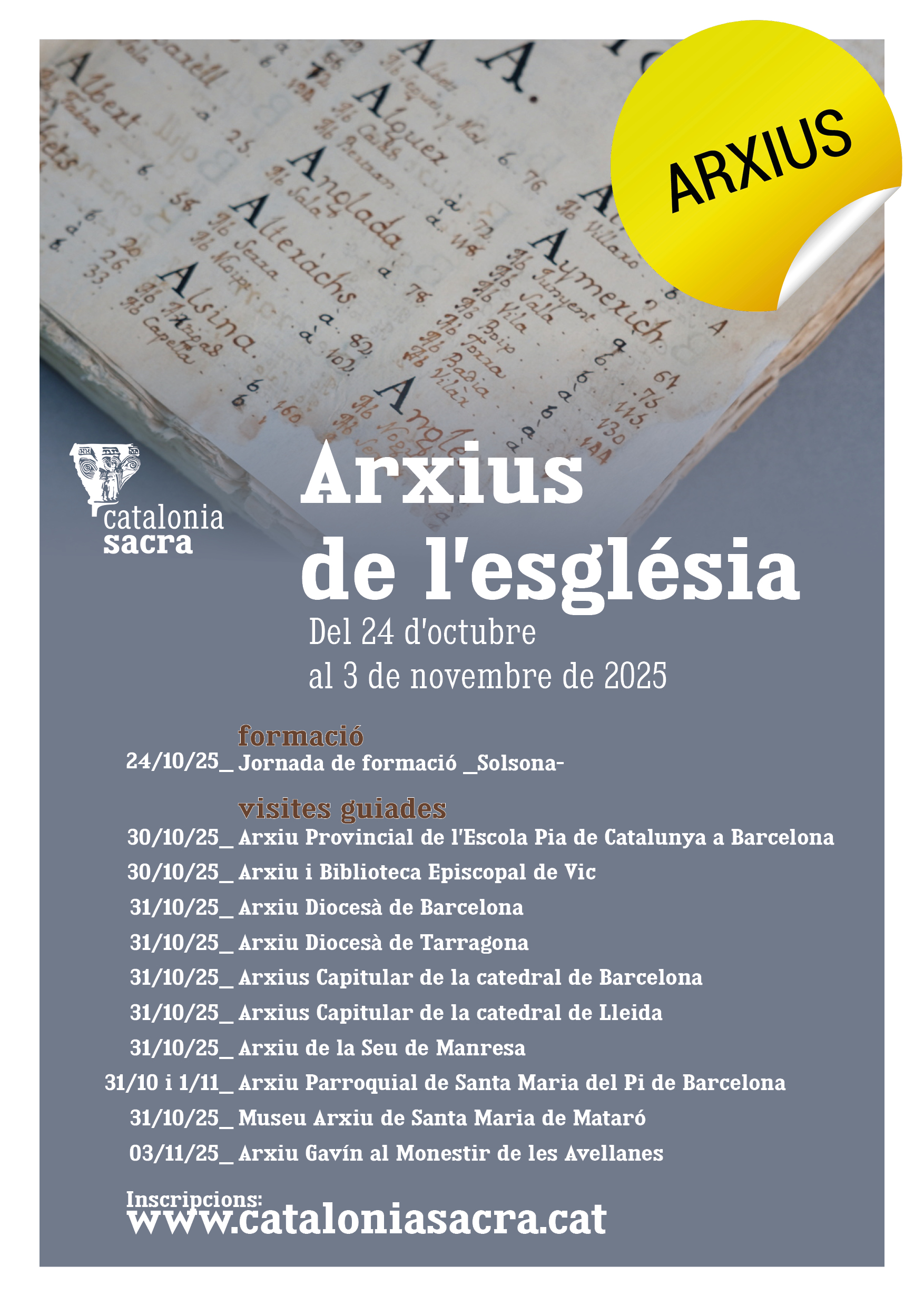 Coincidint amb la celebració a Barcelona del Congrés Internacional d'Arxius de l'ICA (International Council on Archives), que tindrà lloc entre el 27 i el 30 d'octubre, el Museu Arxiu de Santa Maria, conjuntament amb una desena d'arxius eclesiàstics més, obrirà les portes per mostrar els seus fons documentals. Us enviem el cartell anunciador de l’activitat amb la llista d’arxius que hi participen. A l’estatge del Museu Arxiu (c. de Beata Maria, 3) es faran dues visites guiades el divendres 31 d’octubre: la primera a les 19 h i la segona a les 20 h. L’activitat és gratuïta i cal inscriure’s a www.cataloniasacra.cat/agenda.