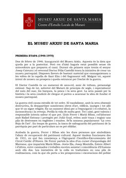 Paral·lelament l’equip incorpora una nova dimensió museística al conjunt de l’església, vertebrada en tres seccions: Les Santes, El Roser i el conjunt barroc dels Dolors, amb l’obra pictòrica d’Antoni Viladomat. El 3 de febrer de 1979 s’inaugura oficialment el renovat Museu Arxiu. I l’any 1981 s’adquireix la casa de cos número 3 del carrer Beata Maria, actual estatge de l’arxiu.