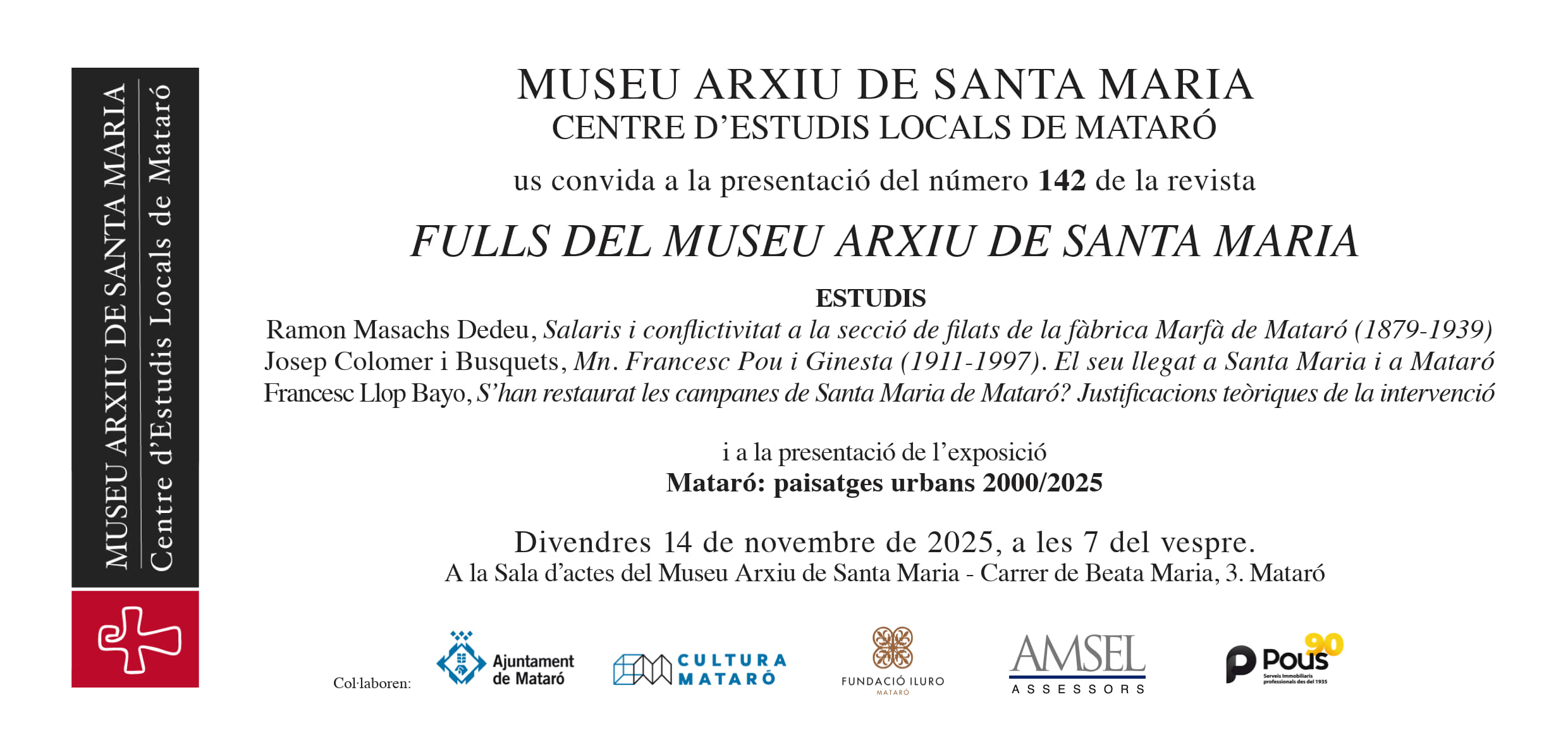 El divendres 14 de novembre de 2025, a les 7 del vespre, l’equip del Museu Arxiu de Santa Maria celebrarà un acte per presentar, d’una banda, el número 142 de la revista Fulls del Museu Arxiu de Santa Maria que inclou tres estudis: un de Ramon Masachs Dedeu sobre els salaris i la conflictivitat laboral a la fàbrica tèxtil Marfà de Mataró durant el període 1879-1939; un altre de Mn. Josep Colomer i Busquets sobre Mn. Francesc Pou i Ginesta (1911-1997), rector de la parròquia de Santa Maria entre 1957 i 1993; i un darrer de Francesc Llop i Bayo dedicat a la restauració de les campanes de Santa Maria. D’altra banda, es presentarà la nova exposició organitzada pel Museu Arxiu: Mataró: Paisatges urbans 2000/2025, en què s’exposen fotografies de l’any 2000 de diversos indrets mataronins acarades amb altres dels mateixos llocs fetes el 2025. En aquesta confrontació d’imatges separades per vint-i-cinc anys es palesa la transformació radical experimentada pel teixit urbà de Mataró, que ha condicionat la vida de la nostra gent en molts carrers i barris. La mostra estarà oberta del 14 de novembre al 13 de desembre, els dijous, divendres i dissabtes de 6 a 2/4 de 9 del vespre (excepte els dies 29 de novembre i el 6 de desembre), a la sala d’actes del Museu Arxiu de Santa Maria, carrer de Beata Maria 3.