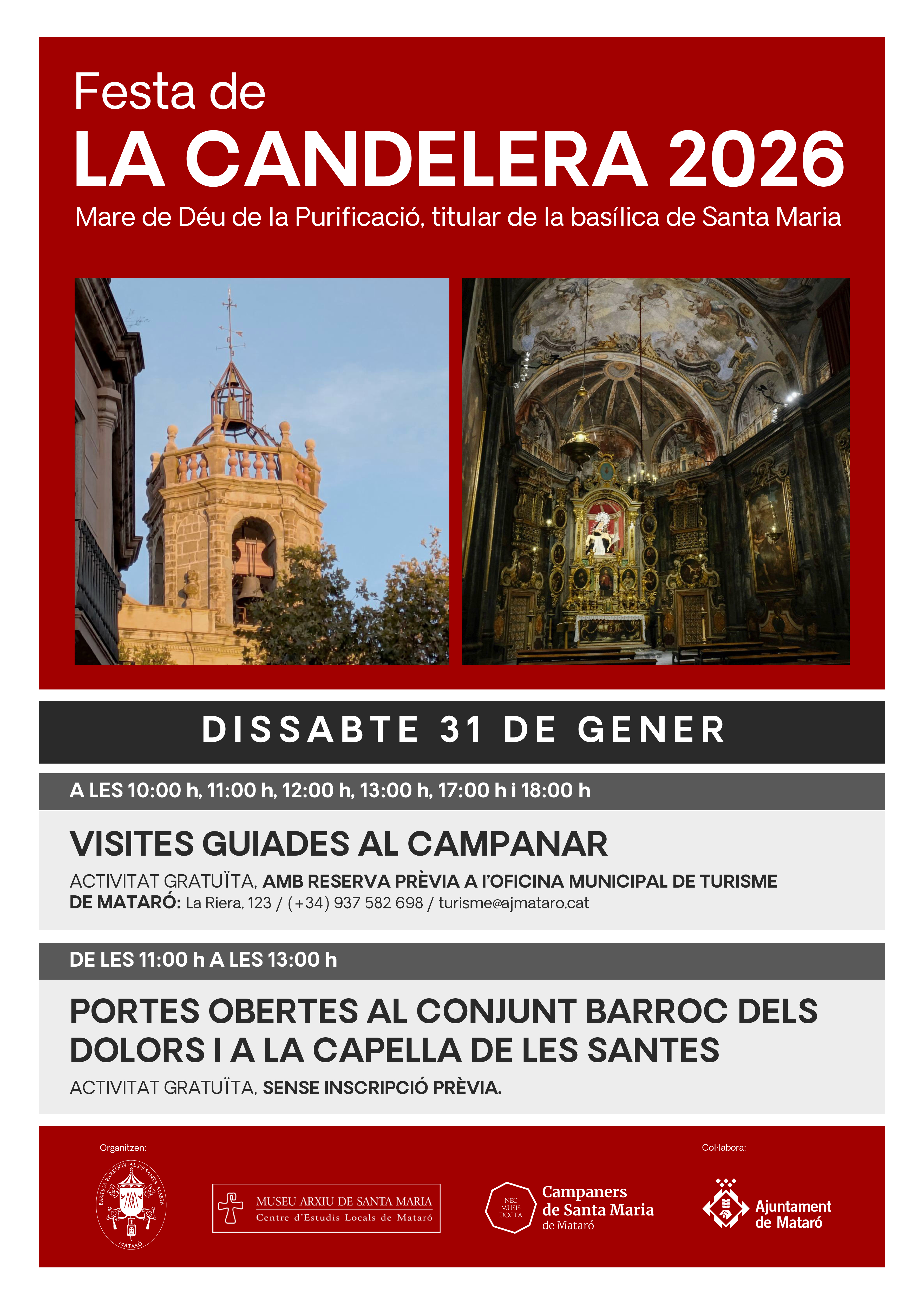 El dissabte 31 de gener, durant tot el dia hi haurà visites guiades al campanar, en sis torns d’una hora de durada (10, 11, 12, 13, 17, 18 h), i el punt de trobada serà la plaça de Santa Maria, a peu de campanar. L’activitat és gratuïta, amb inscripció prèvia, a partir de divendres 23 de gener, a l’Oficina Municipal de Turisme de La Riera, 123 (edifici del Cafè Nou), al telèfon 937 582 698 o al correu turisme@ajmataro.cat. El mateix dia, entre les 11 i les 13 h, hi haurà portes obertes a la capella dels Dolors, un dels espais més importants del barroc català que custodia un extraordinari conjunt pictòric sorgit del taller d’Antoni Viladomat, i a la capella de les Santes, que conté les relíquies de santa Juliana i santa Semproniana, el retaule en baix relleu obra de l’escultor Jordi Puiggalí, les grans pintures de Miquel Massot, el principal col·laborador de Josep Maria Sert, i les despulles del Doctor Josep Samsó i Elias, rector de la parròquia, assassinat el 1936. Activitat gratuïta i sense inscripció prèvia.